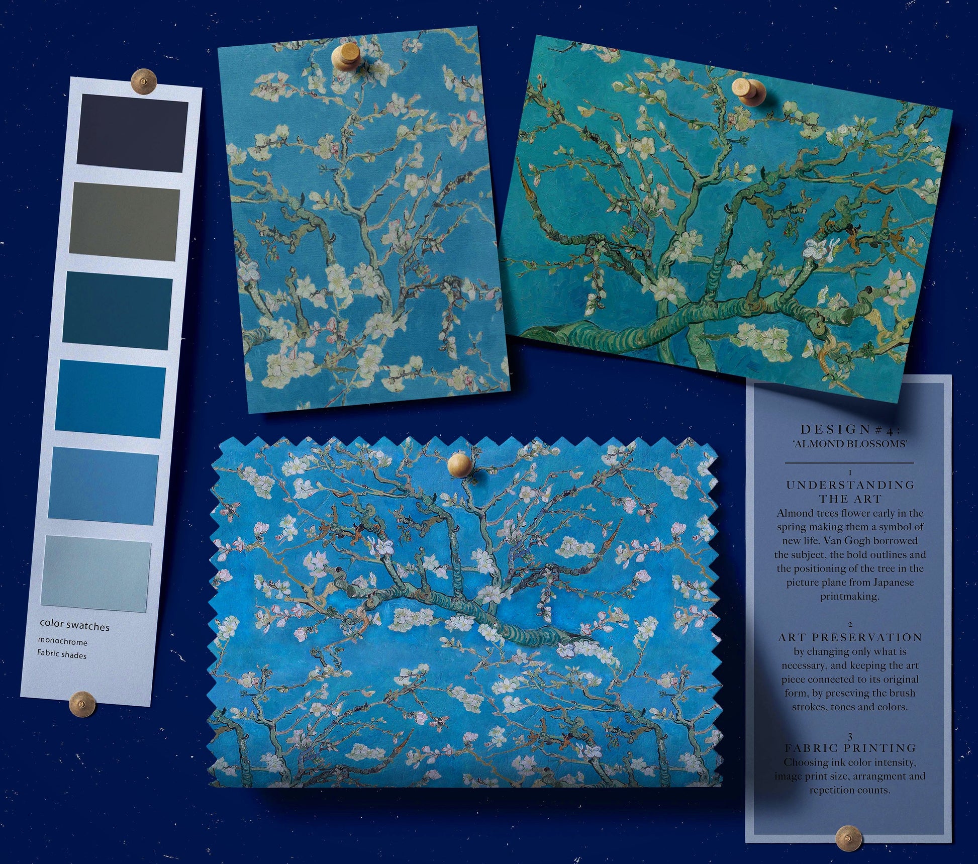 Delicate white blossoms on calming blue hues make this design a tribute to Van Gogh’s celebration of spring and renewal.