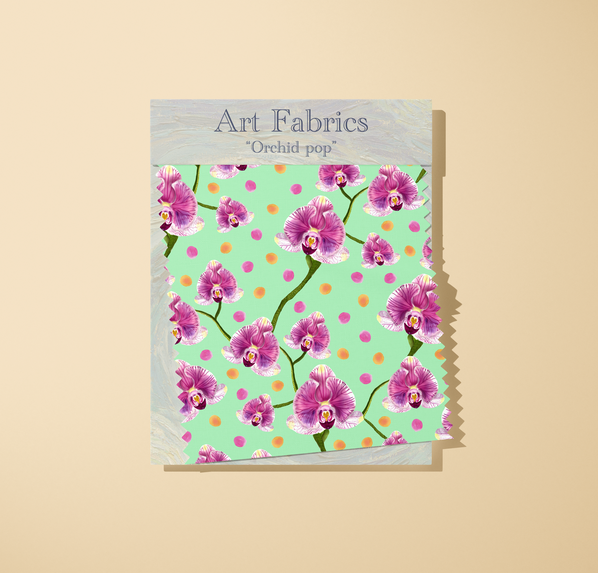 Bright pink orchids bloom over a fresh mint green background, accented by playful watercolor polka dots that float across the scene. A cheerful, artistic print full of movement and charm.