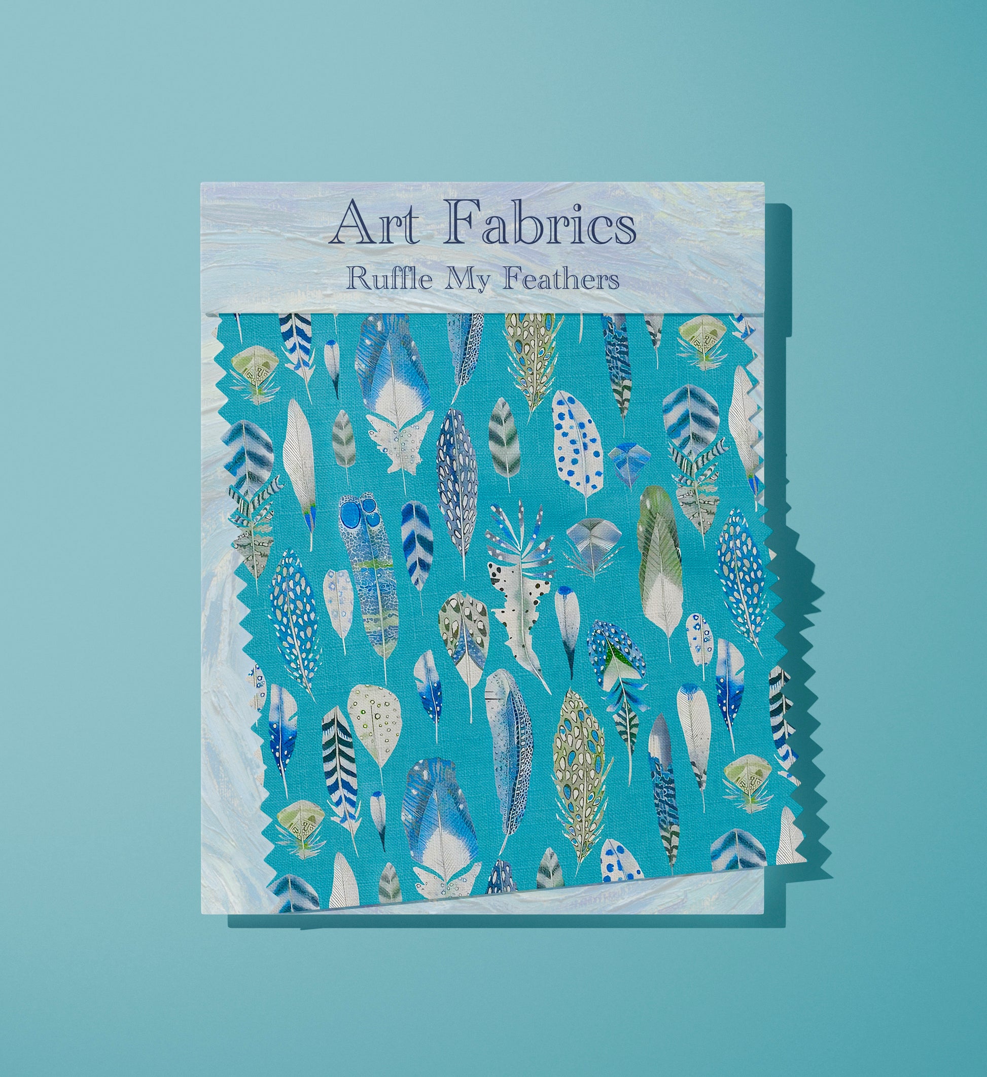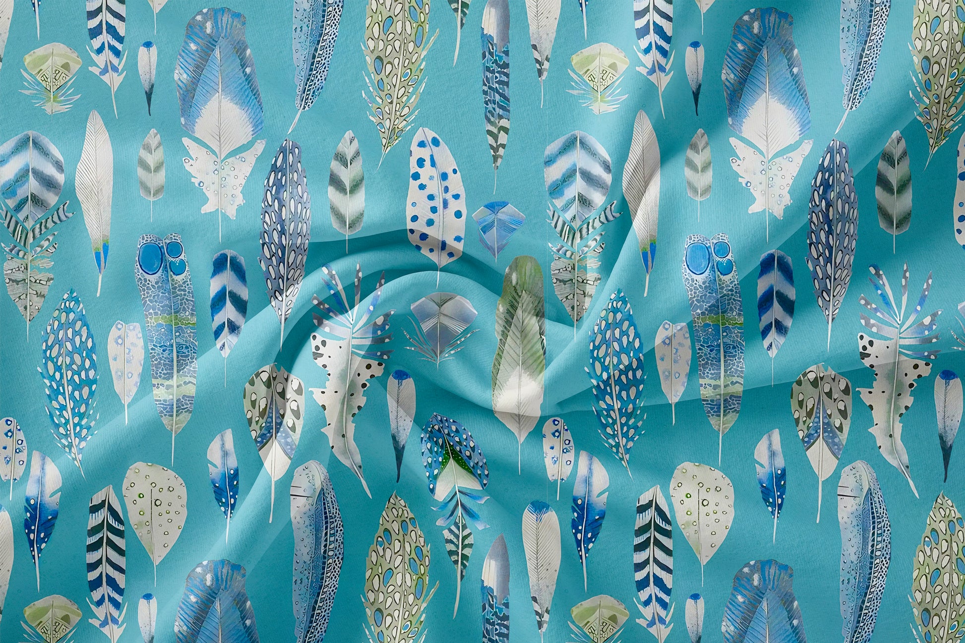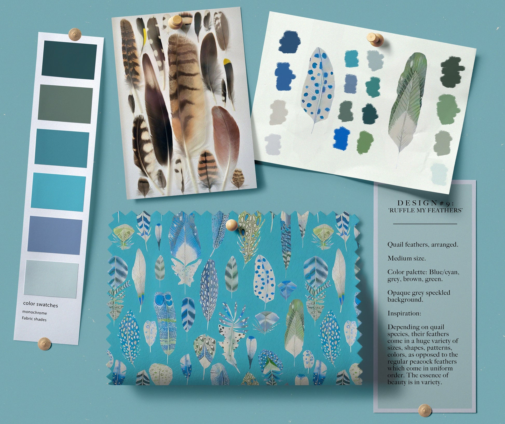 An intricate arrangement of exotic feathers in varied shapes and colors, set against a blueish-grey background. This striking design is elegant, bold, and full of texture and motion.